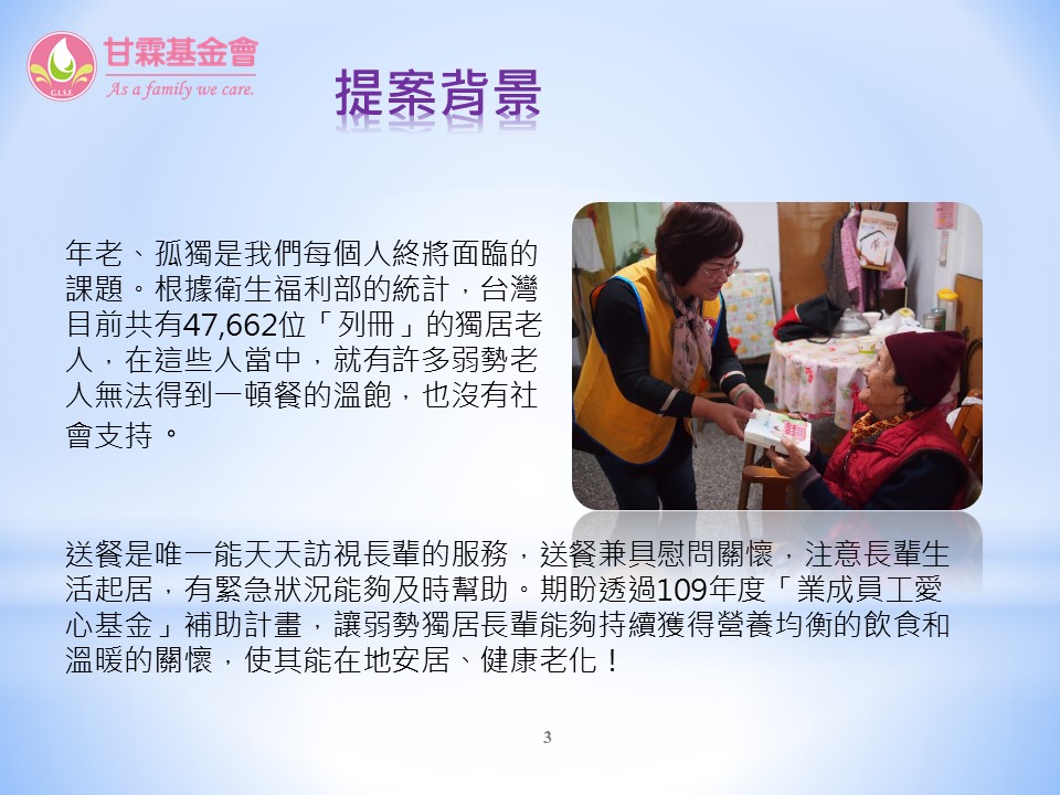 入選單位四:財團法人台中市私立甘霖社會福利慈善事業基金會「聽見角落的聲音-弱勢獨居長輩送餐服務」